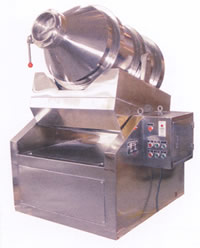 本机混合筒在传动的同时又参与摆动,使筒中物料得以充分混合。混合筒的出料口偏离混合筒圆筒部分的中心线,使该机具有混合迅速、混合量大,出料便捷等特点。